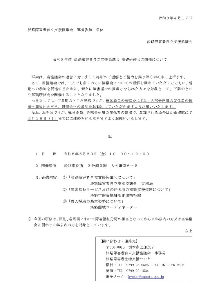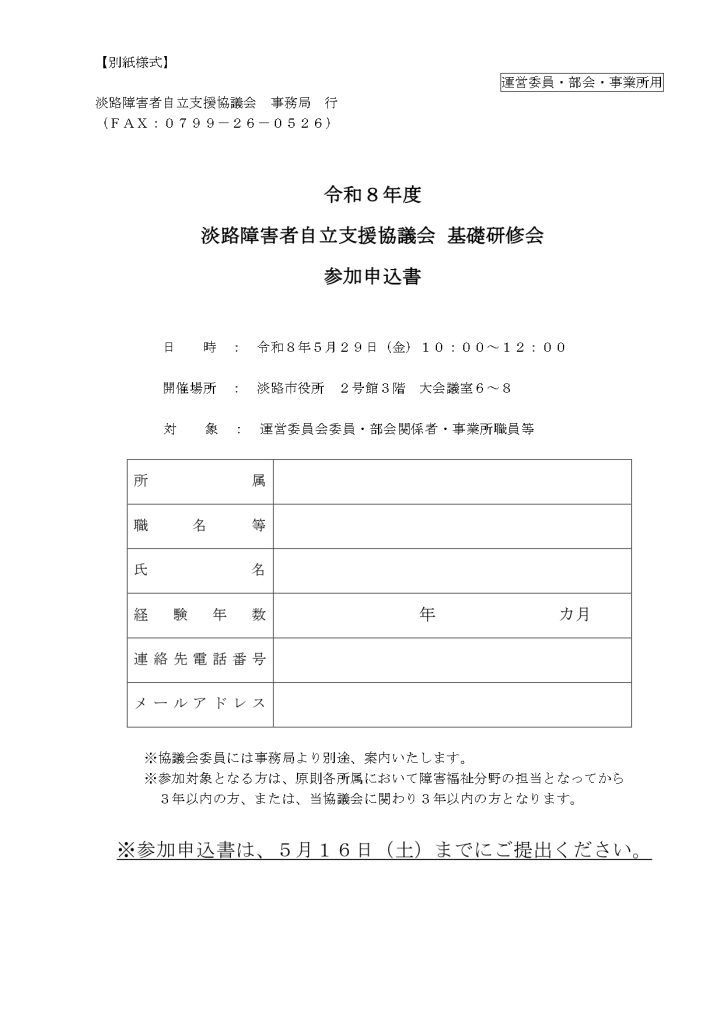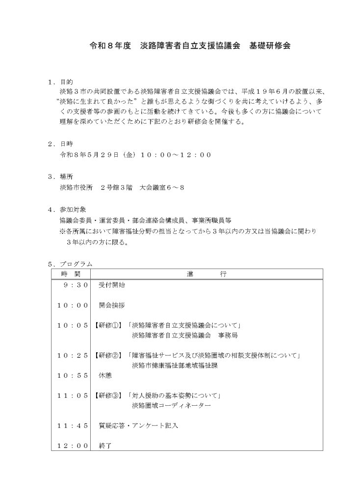参加対象については、淡路圏域の『自立支援協議会委員』『運営委員』『部会・連絡会構成員』『事業所職員等』の中で、各所属において障害福祉分野の担当となってから、3年以内の方又は当協議会に関わり3年以内の方となります。